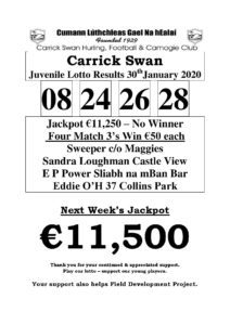Carrick Swan Juvenile Lotto Results 30th Oct. ‘25