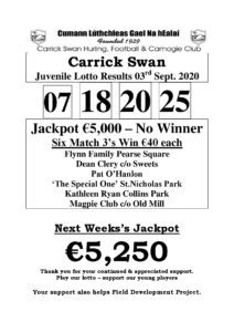 Carrick Swan Juvenile Lotto Results 03rd Jan. ‘26