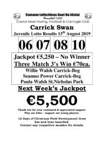 Carrick Swan Juvenile Lotto Results 11th Dec. ‘25