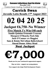 Carrick Swan Juvenile Lotto Results 27th Nov. ‘25