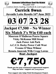 Carrick Swan Juvenile Lotto Results 16th Oct. ‘25